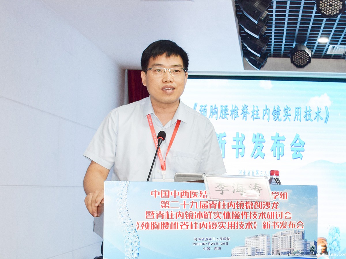 李海涛代表出版社在会上讲话。他指出,《颈胸腰椎脊柱内镜实用技术》一书是河南省直第三人民医院各位专家在脊柱外科领域锐意进取、开拓创新的智慧结晶,凝聚了图书出版在传播知识、传承技术方面的价值内涵,为推动我国脊柱内镜技术更好更快发展做出了重要贡献。他还向在场嘉宾介绍了milan米兰体育app的历史和发展情况,强调医学出版是郑大社的传统优势,希望以《颈胸腰椎脊柱内镜实用技术》一书的出版为良好开端,与省内外的业内专家、委员及河南省直第三人民院建立密切联系,通过出版合作,把先进的医疗理念和精湛的临床技术传承下去、传播出去,惠及更多的人民群众,提高中国的医学影响力,并展现milan米兰体育app在医疗卫生事业发展中的使命和担当。