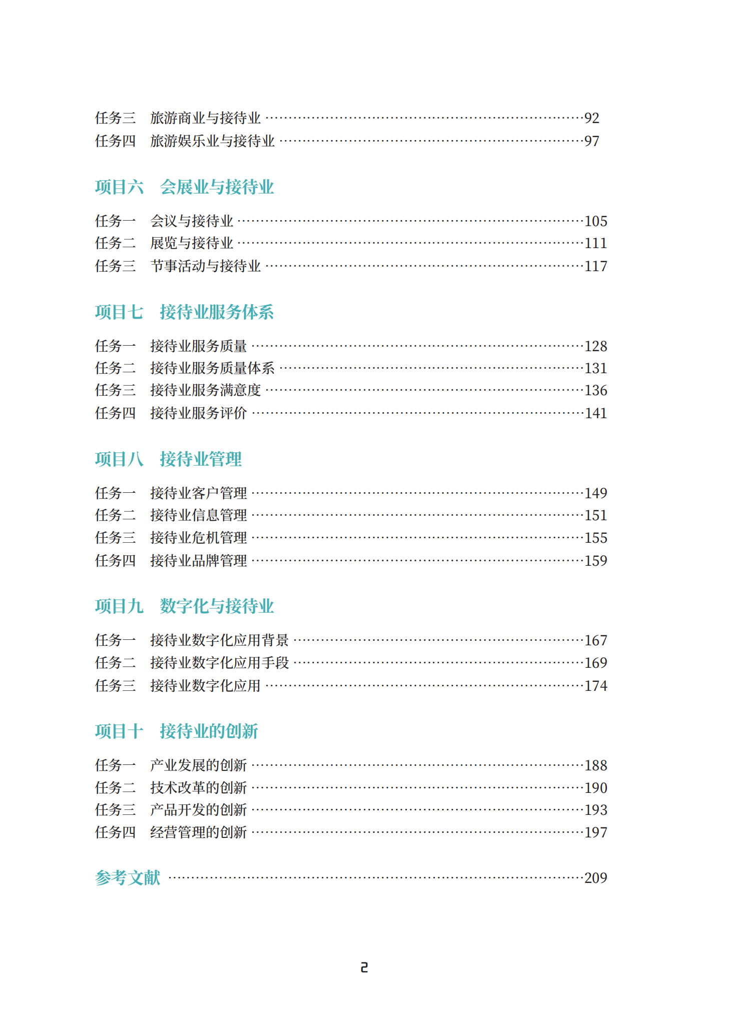 全书分为三大模块:第一模块为课程的基础,主要讲述接待业的概念、发展历程及范围,从业人员的职业现状及从业要求和接待业的发展愿景;第二模块为接待业的核心业务,详细介绍了餐饮、住宿、交通、游娱、会展业等接待业的概念、发展趋势以及接待内容,是接待业务的重要组成部分;第三模块为接待业的经营与管理,包括接待业的服务质量体系、满意度与服务评价,接待业的客户管理、信息管理、危机管理及品牌管理,接待业的数字化发展及创新。