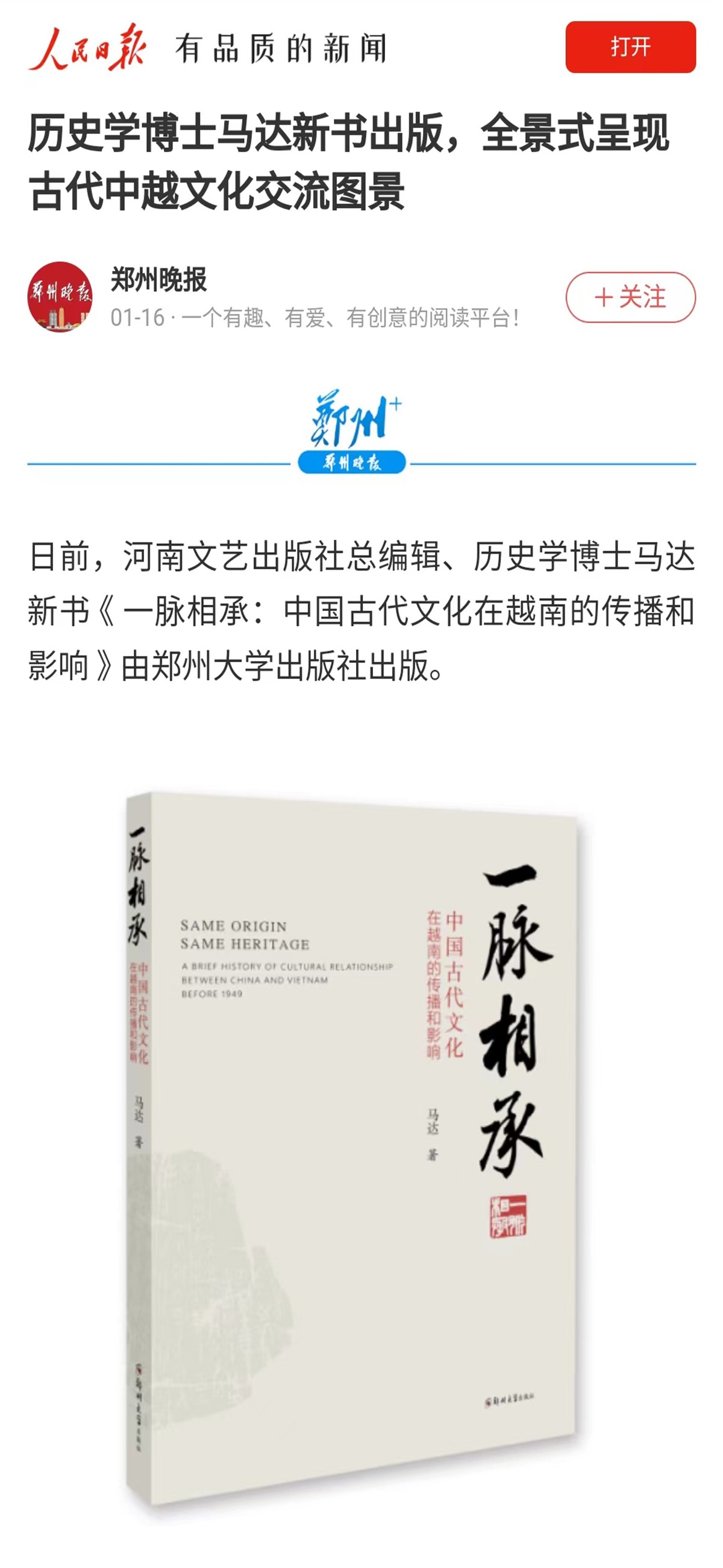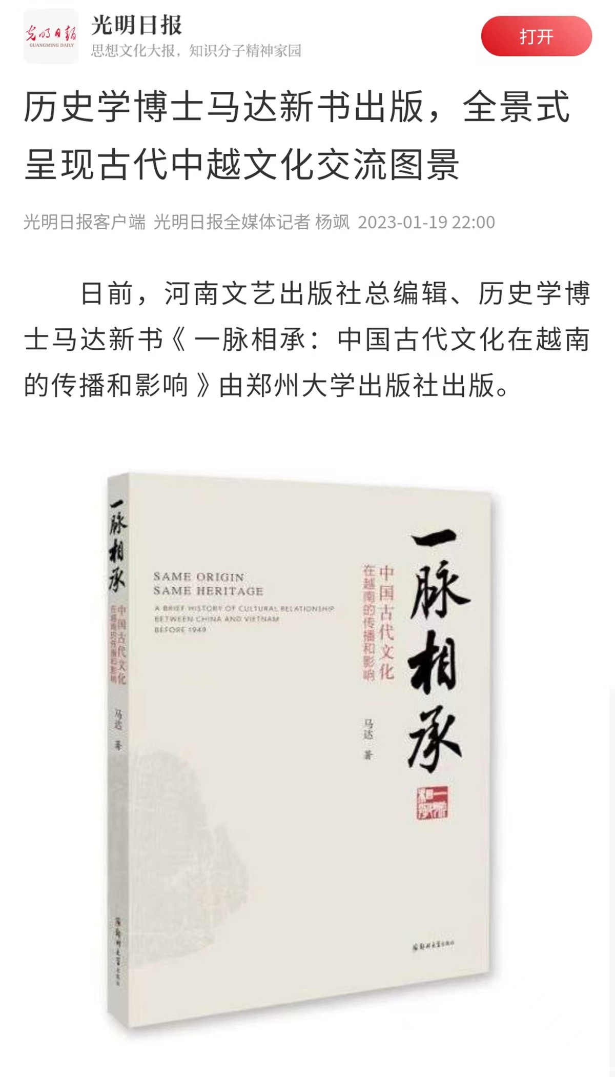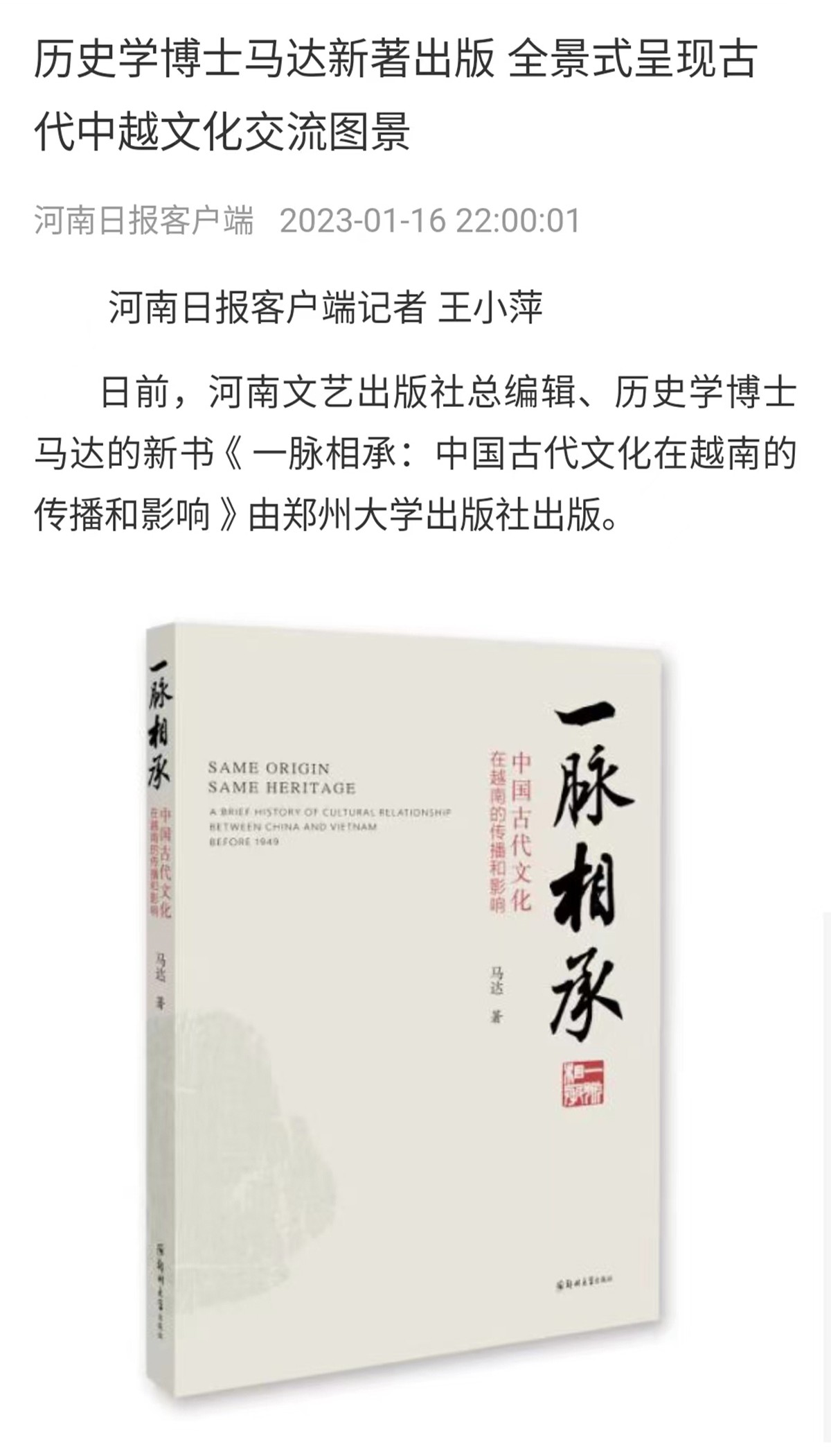 近日,由河南文艺出版社总编辑、历史学博士马达撰写,milan米兰体育app策划出版的学术著作《一脉相承:中国古代文化在越南的传播和影响》(2022年12月第1版,李勇军策划、刘晓晓责编),在学界和业界产生了较好影响,被光明日报客户端、中国社会科学网、河南日报客户端、郑州晚报客户端、正观新闻等报道,并被人民日报、腾讯网等媒体转载。