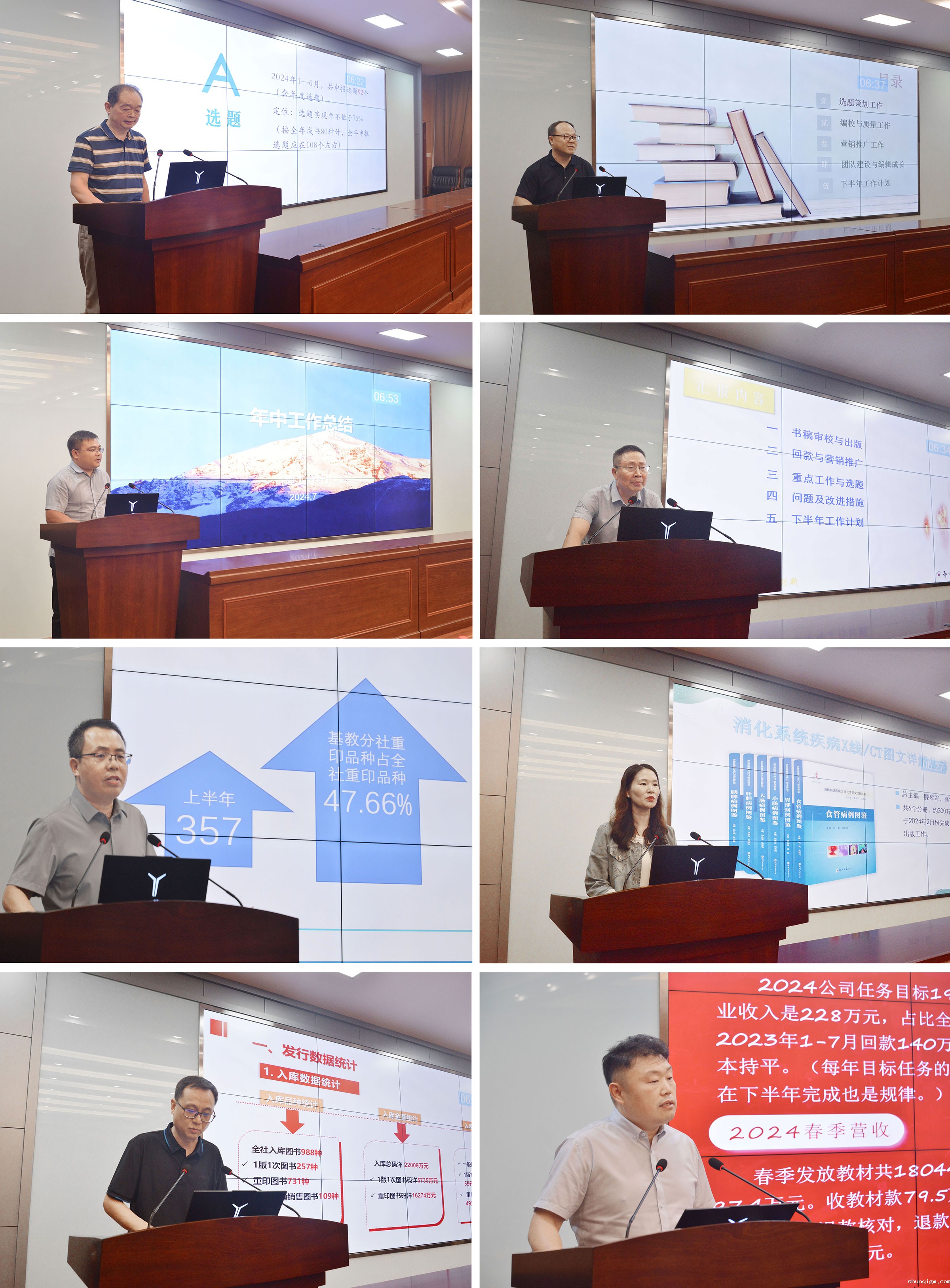 会上,各分社、编校中心、营销发行中心、河南嵩岳图书有限公司、郑州眉湖图文设计有限公司等9个分社或部门的负责人,分别就本单位上半年回款及费用、图书出版进度、重点图书策划出版、社会效益、编校质量、编辑成长等工作完成情况和取得的成绩进行详细总结,认真梳理存在的问题和不足,有针对性地提出下半年工作努力方向。