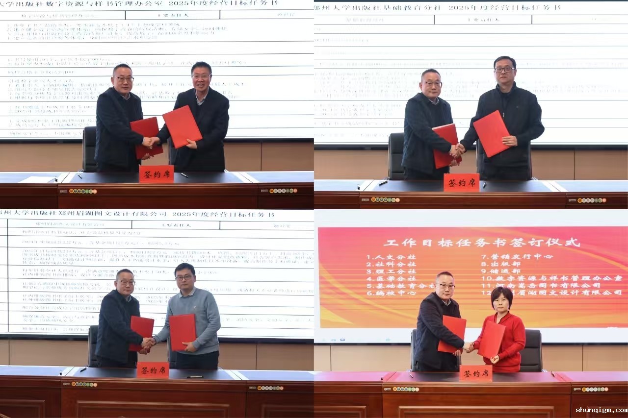 在全社员工的共同见证下,卢纪富代表出版社与人文分社、社科分社、理工分社、医学分社、基教分社、编校中心、营销发行中心、出版部、储运部、数字资源与样书管理办公室以及河南嵩岳图书有限公司、郑州眉湖图文设计有限公司2个子公司负责人签订2025年度工作目标任务书,明确各部门2025年度主要目标和任务。