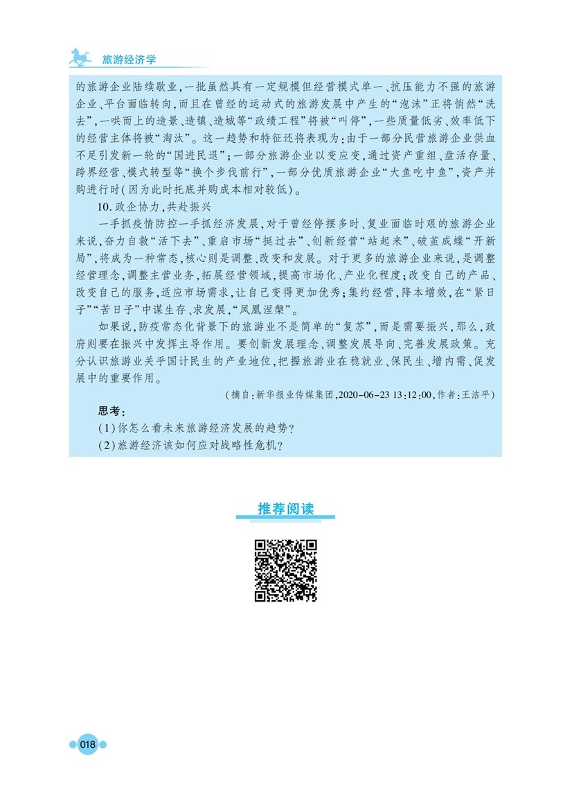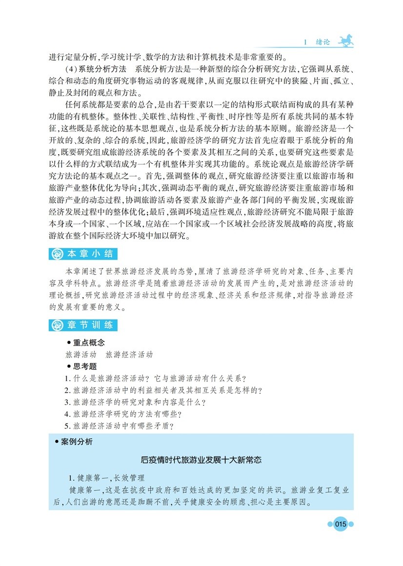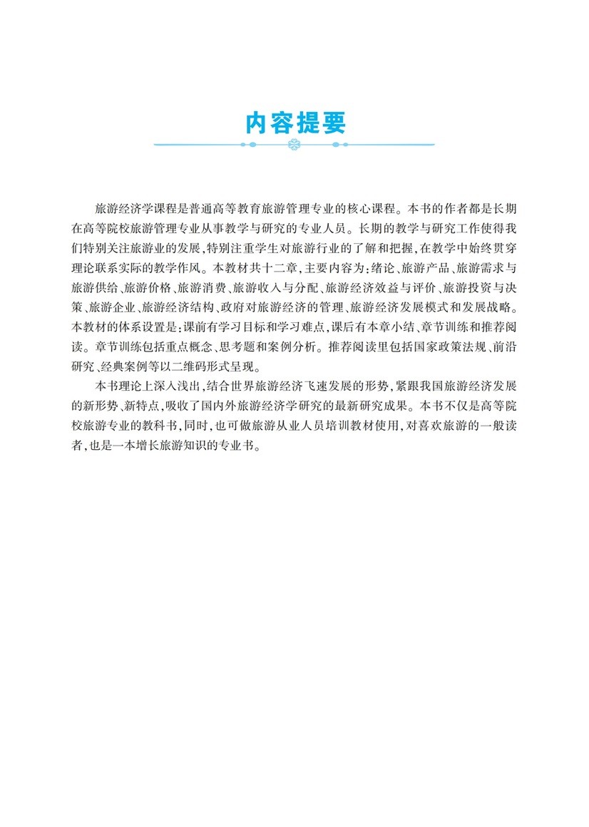 《旅游经济学》课程是普通高等教育旅游管理专业的核心课程。本教材体系科学,层次分明,内容丰富。共十二章,主要内容为: 绪论、旅游产品、旅游需求与旅游供给、旅游价格、旅游消费、旅游收入与分配、旅游经济效益与评价、旅游投资与决策、旅游企业、旅游经济结构、政府对旅游经济的管理、旅游经济发展模式和发展战略。本教材的体系设置是:课前有学习目标和学习难点,课后有小结、章节训练和推荐阅读。章节训练包括概念、思考题和案例分析。