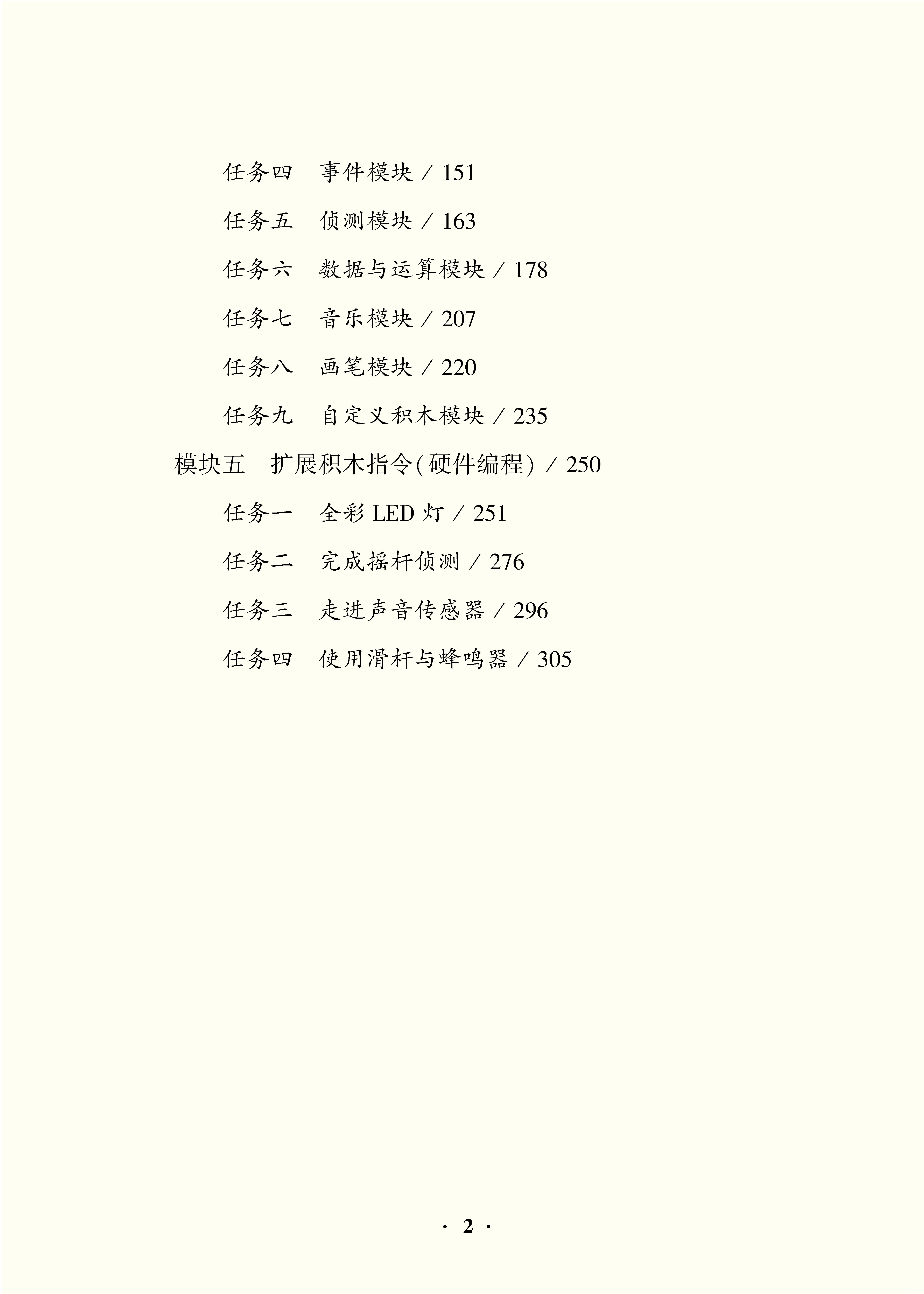本书共分为两个篇章,第一篇为基础篇,主要分为两个模块,模块一介绍了计算机使用基础知识,方面读者建立对计算机的基础认识,掌握基本操作;模块二介绍Scratch基础知识和基本指令,读者认识程序控制的基本结构。第二篇为实战篇,主要分为三个模块,模块一通过学习任务一、任务二,读者能够使用Scratch绘制舞台背景及角色,完成艺术创作,为后续项目实现奠定基础;模块二通过学习任务一到任务七,详细介绍Scratch积木指令,完成对语法的学习;模块三通过学习任务一到任务四,读者能使用智能硬件连接Scratch,拓展积木指令,开发更有趣的编程项目。
