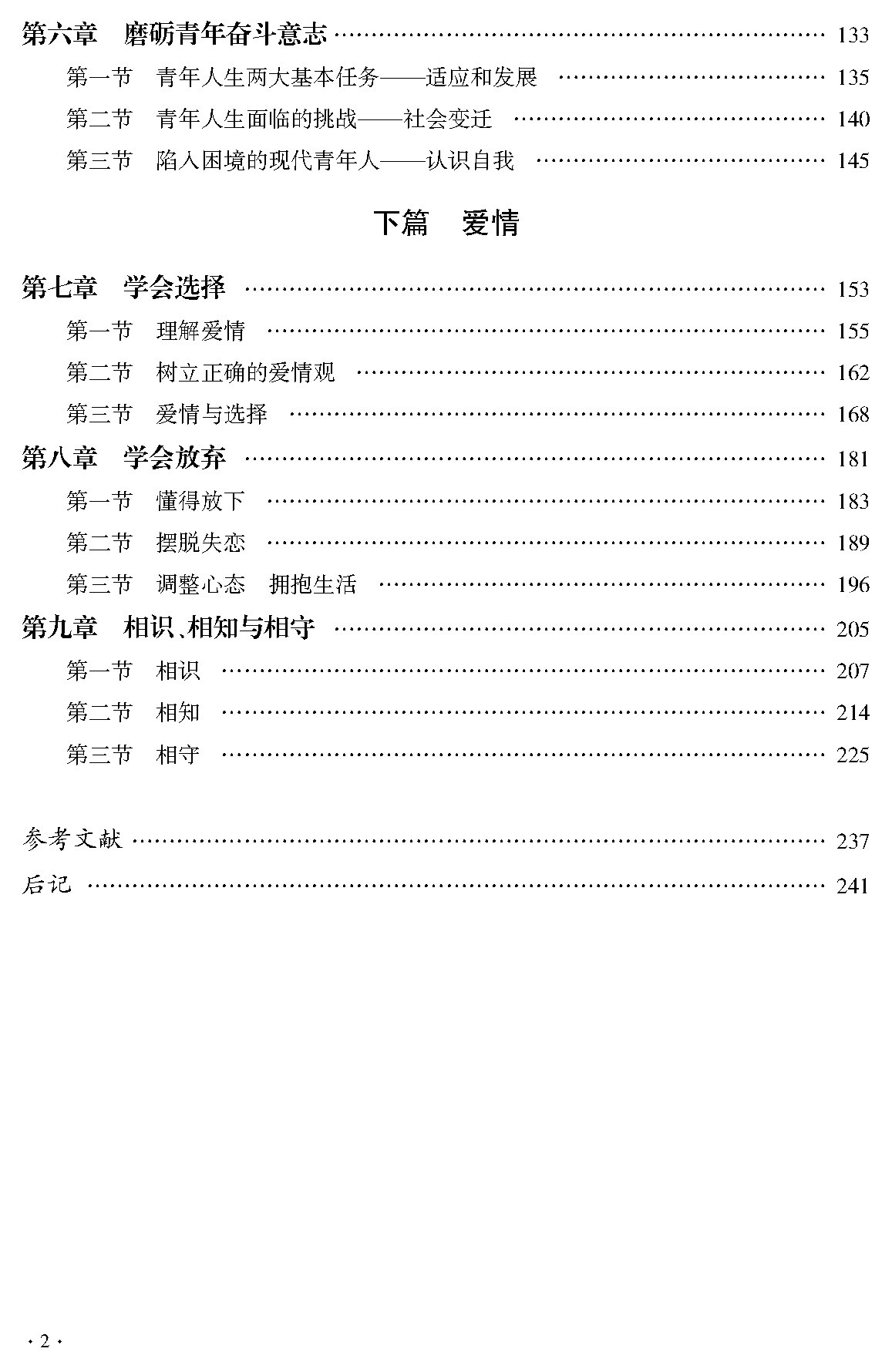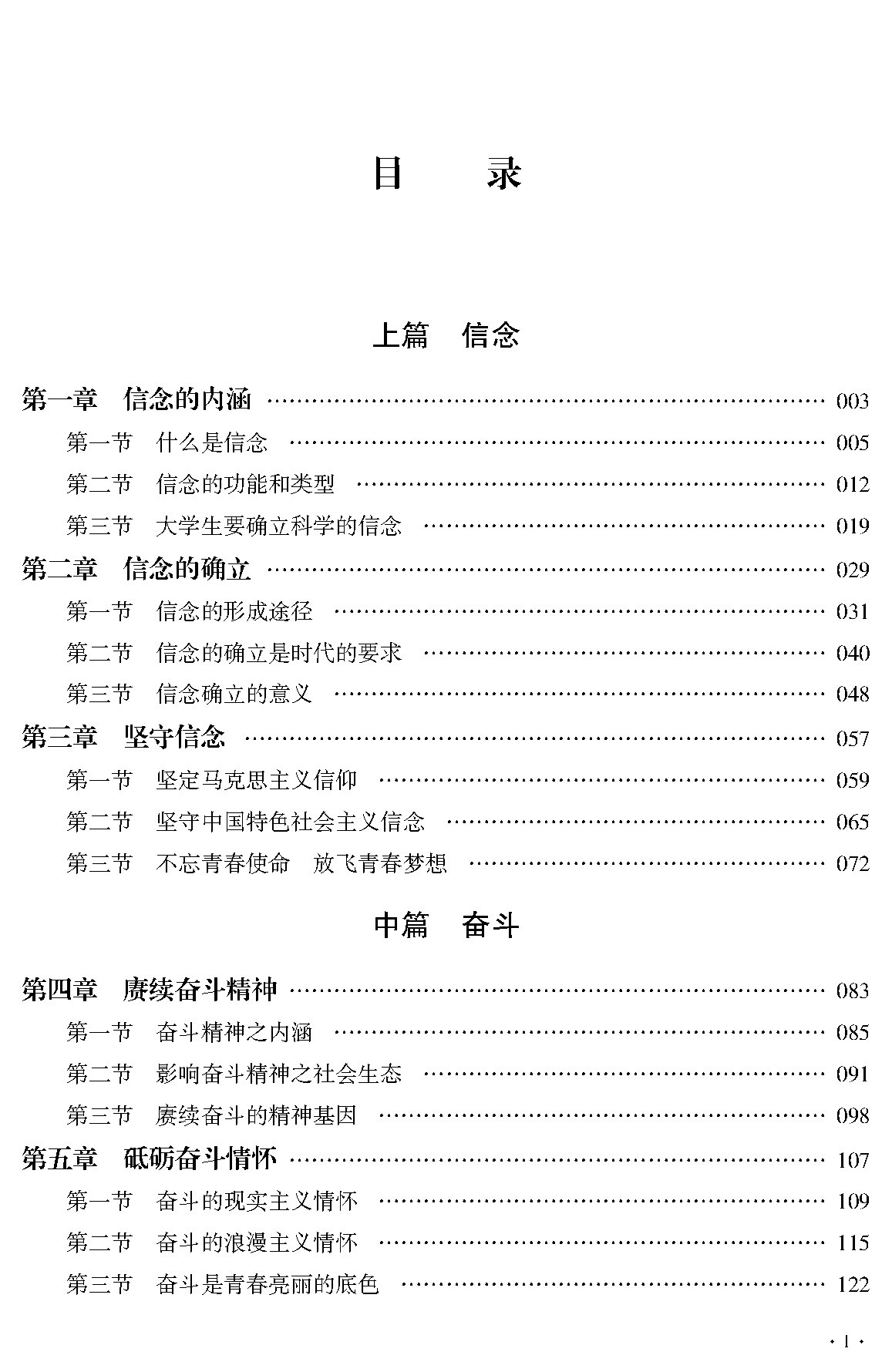“信念篇”主要讲述了信念的科学内涵和基本特征、信念的类型和确立以及当代大学生如何坚守伟大的信念;“奋斗篇”主要讲述了当下奋斗精神的内涵及影响因素,引导大学生要砥砺奋斗情怀、磨砺奋斗意志;“爱情篇”主要讲述了爱情与人生、爱情与学业的关系,引导大学生要学会正确对待爱情,学会选择和放弃,真正领悟爱情的魅力和意义。