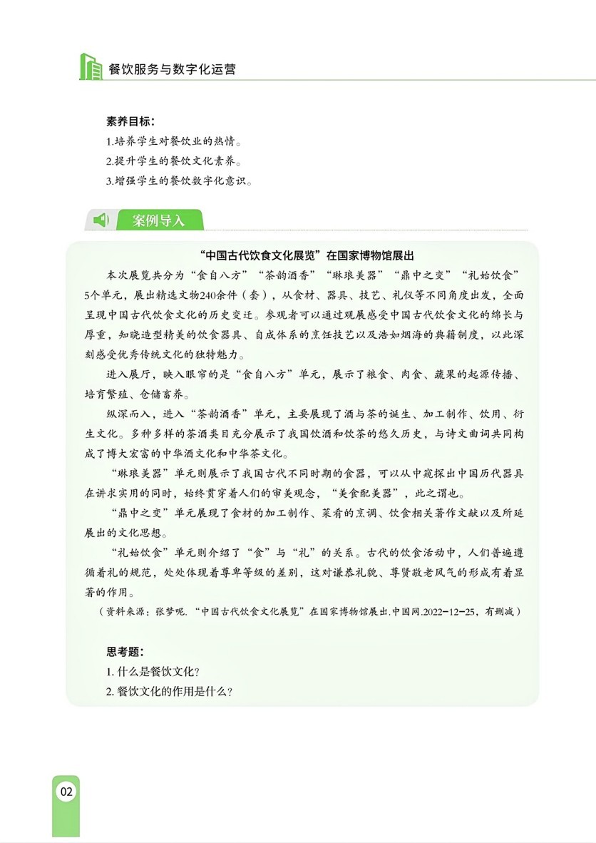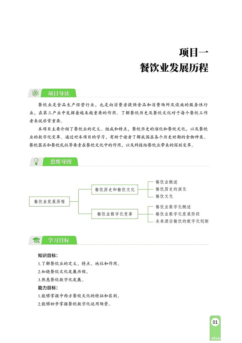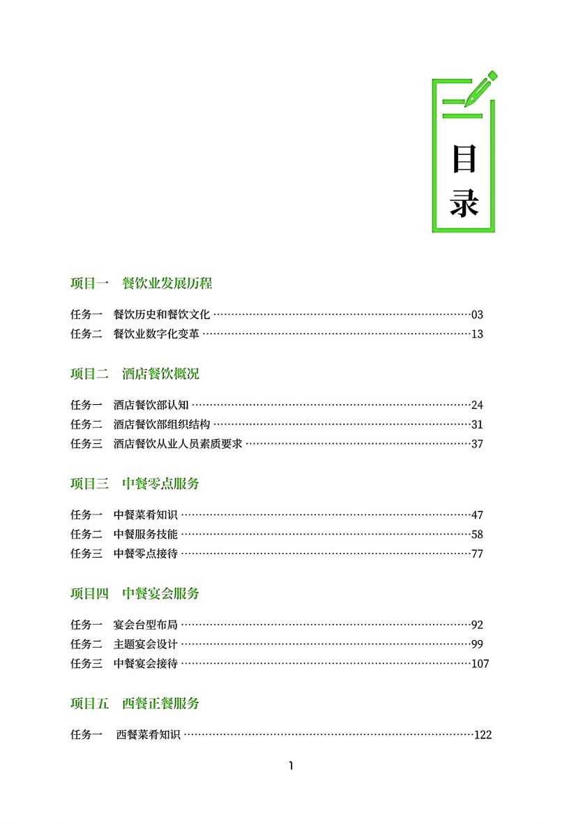 本教材以核心能力培养为主线,依据岗位顶层设计教材结构,分析相关岗位所需职业核心能力,与行业企业联合,将企业的新技术、新规范、新工艺及时融入教材内容,并借助信息技术丰富教材形态,建成集“思政融入、岗课融合、赛证融通、纸数融创” 于一体的新形态教材。全书共分为餐饮业发展历程、酒店餐饮概况、中餐零点服务、中餐宴会服务、西餐正餐服务、西餐休闲服务、西餐宴会服务、餐饮运营及数字化场景、餐饮管理及数字化应用九个项目。