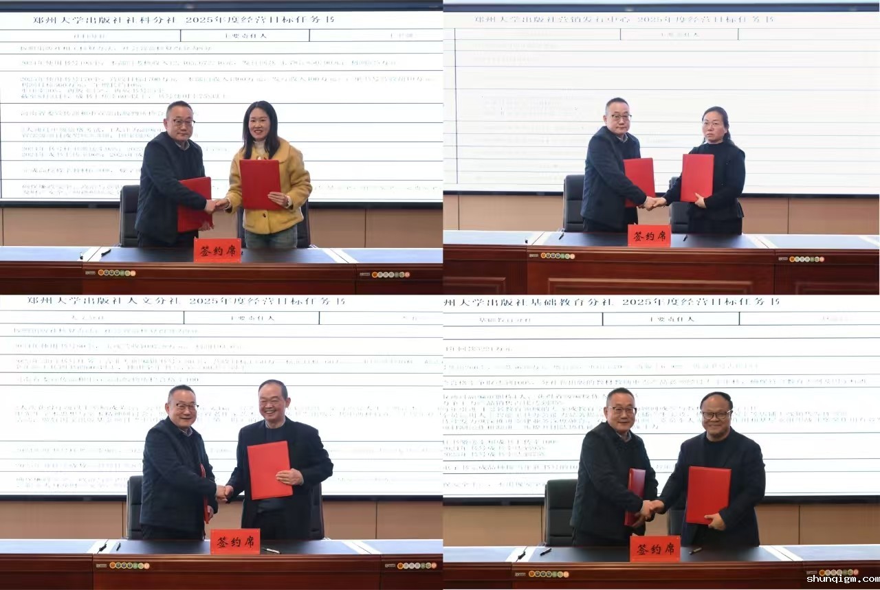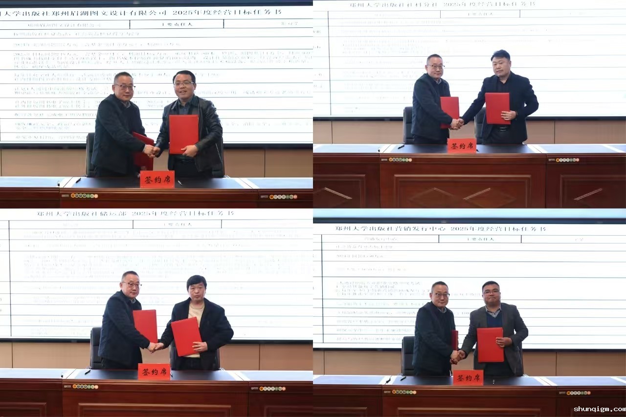 在全社员工的共同见证下,卢纪富代表出版社与人文分社、社科分社、理工分社、医学分社、基教分社、编校中心、营销发行中心、出版部、储运部、数字资源与样书管理办公室以及河南嵩岳图书有限公司、郑州眉湖图文设计有限公司2个子公司负责人签订了2025年度工作目标任务书,明确各部门2025年度主要目标和任务。