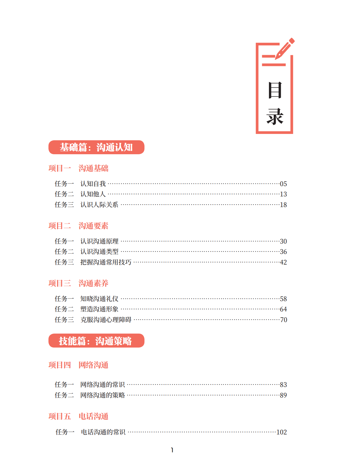 本书采用项目化的编写思路,突出职业教育中以能力为本位的理念,结合党的二十大精神,探讨如何在实际工作和生活中运用有效的沟通技巧,促进团结合作、协调发展。全书分为基础篇、技能篇、实战篇,共十个项目。基础篇(沟通认知)由沟通基础、沟通要素、沟通素养组成,主要培养学生掌握沟通的基本知识;技能篇(沟通策略)由网络沟通、电话沟通、书面沟通组成,主要培养学生掌握常用的沟通技巧;实战篇(沟通应用)由面试沟通、会议沟通、销售沟通、客服沟通组成,主要培养学生综合运用沟通知识和技能的能力。