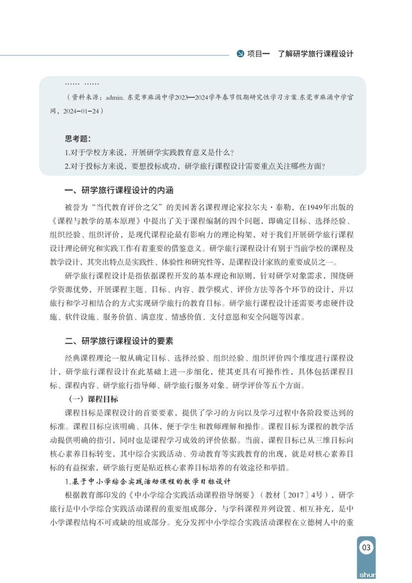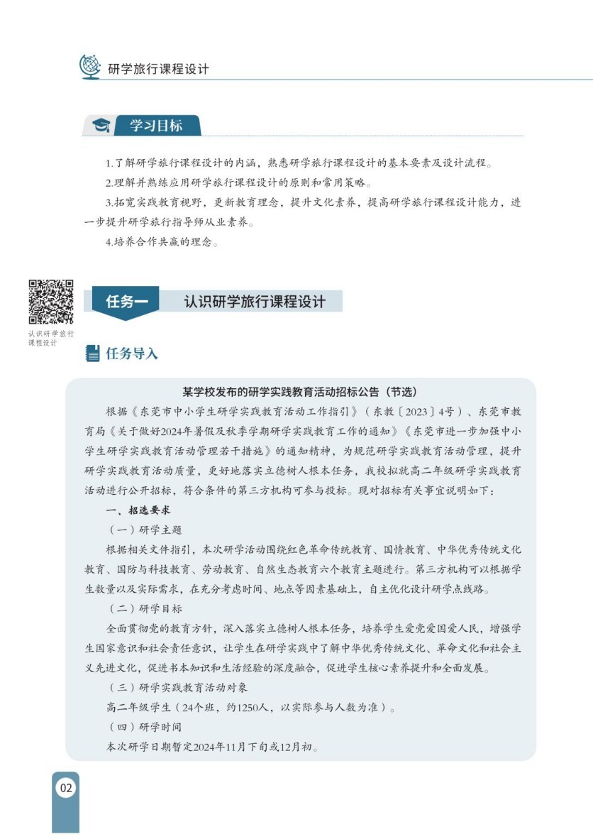 本教材紧紧围绕学习者能力培养和研学旅行课程设计能力发展要求,以研学旅行的学情到评价等课程诸要素设计展开,以“项目—任务—活动”的学习方式组织学习内容。本教材按照“从了解到认识、从认识到理解、从理解到设计、从设计到开发”的思路编写,包括了解研学旅行课程设计、掌握研学旅行课程学情分析方法、确定研学旅行课程主题、提升研学旅行课程目标设计能力、设计研学旅行课程内容、设计研学旅行教学方法、策划研学旅行教学过程、开展研学旅行课程评价、设计研学旅行课程手册等项目,每个项目设有项目导读、思维导图、学习目标、案例导入、知识拓展、活动、育人课堂、综合实训等环节,并穿插数字化实践、岗课赛证、课程思政等内容。